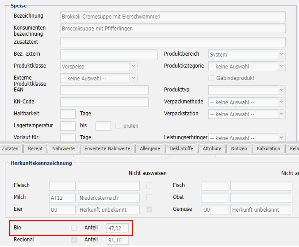 Die Summe des Gewichts der Zutaten mit der Kennung "bio" wird dem Gesamtgewicht aller Zutaten gegenübergestellt und prozentuell bewertet. Der Prozentwert wird gespeichert und in der Lasche Spezifikation der Speise anzeigt. Übersteigt der Wert den in den Grundeinstellungen für „bio“ definierten Wert, dann wird automatisch der Haken „bio“ gesetzt. Diese Kennung kann nicht manuell gesetzt werden!