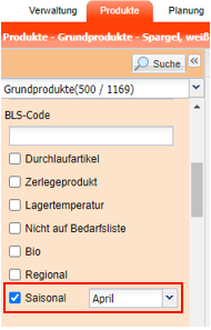 Ähnlich dazu verhält sich die Suche "saisonal". Ist die Suchoption gesetzt, werden alle Produkte gefunden, die einen Saisonkalender hinterlegt haben.\ Wird zusätzlich auf eine Kalendermonat eingeschränkt, werden nur Produkte aufgelistet, deren Saison diesen Monat beinhaltet.