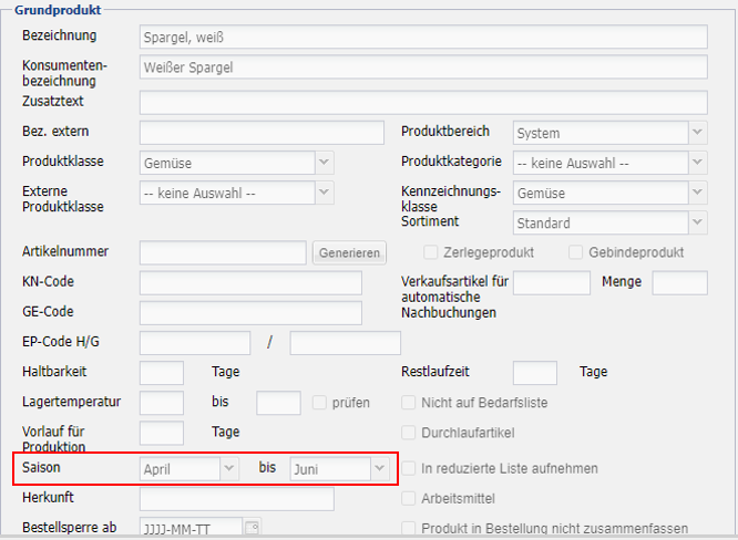 Bei allen Einkaufsprodukten kann individuell ein Zeitraum (in Monaten) für die Saison eingestellt werden, z.B. „Juni bis Juli“, „Jänner bis Dezember“, „Dezember bis Jänner“, „August bis August“. Die Einstellung gelten gleichermaßen für alle Hauptkostenstellen (Küchen) des ganzen Mandanten.