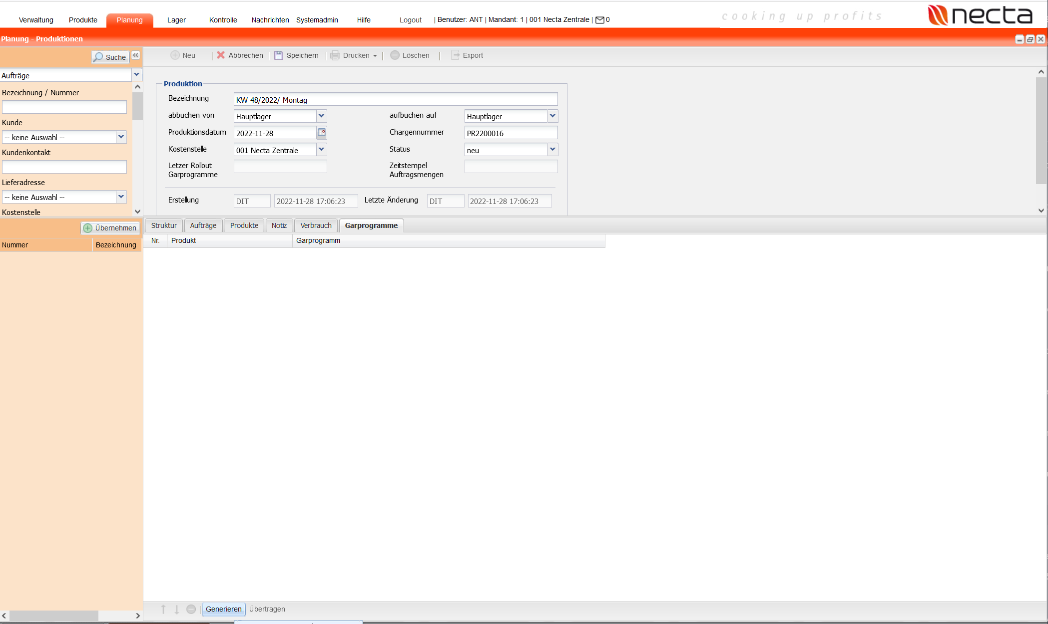 Rollouts für Connected Cooking werden über eine necta Produktion erzeugt. Sie erstellen wie gewohnt eine Produktion in necta. Ist die Produktion vollständig, übernehmen Sie die Garprogramme über die Schaltfläche "Generieren" in die Produktion.