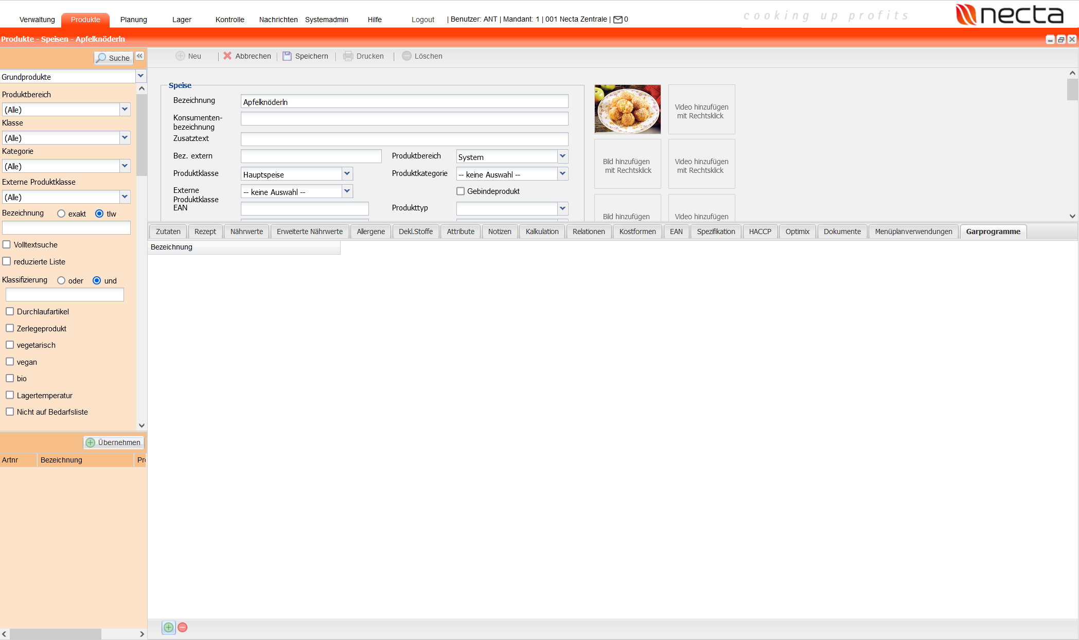 Ist die Rational-Schnittstelle aktiv können an Speisen Garprogramme hinterlegt werden. Dies geschieht in der Lasche "Garprogramme" der Speise.