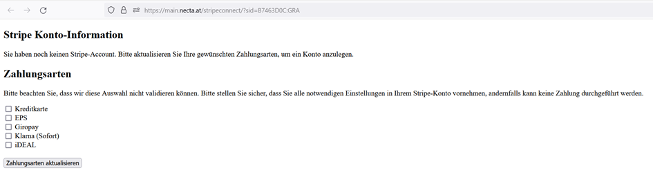 Leider ist es technisch nicht möglich, die Zahlungsarten, die Sie in Stripe aktivieren, automatisch nach necta zu übernehmen. Diese Liste muss aber für einen reibungslosen Zahlungsablauf mit der mynecta-Bestell-APP synchron gehalten werden. Nach erfolgreicher Registrierung können Sie deshalb auf der StripeConnect-Seite von necta Ihre Zahlungsarten jederzeit aktualisieren.
