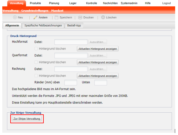 Ist obiger Punkt 1 bereits geschehen, wird im Menüpunkt Grundeinstellungen – Mandant der Button Zur Stripe-Verwaltung aktiv.