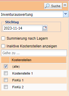| Inaktive Kostenstellen anzeigen | Durch Setzen des Schalters werden auch Inventurauswertungen von inaktiven Kostenstellen angezeigt. |