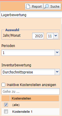 | Inaktive Kostenstellen anzeigen | Durch Setzen des Schalters werden auch Lagerbewertungen von inaktiven Kostenstellen angezeigt. |