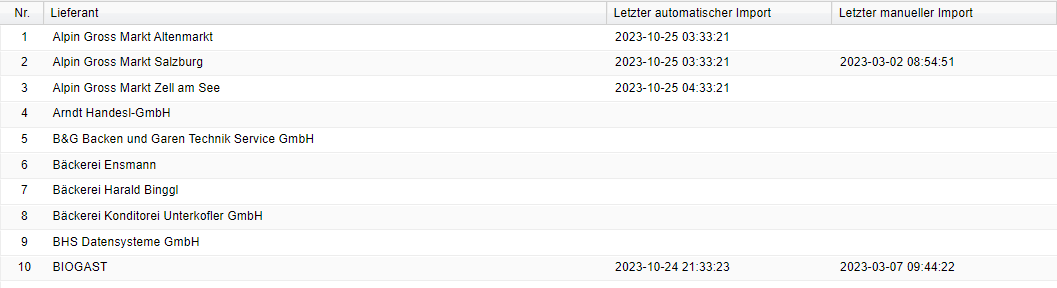 In dieser Funktion werden sämtliche Import der Artikelstämme protokolliert. Eine Sortierung nach Lieferanten, nach letztem automatisch und letztem manuellen Import, sowie ein Export nach Excel ist möglich.