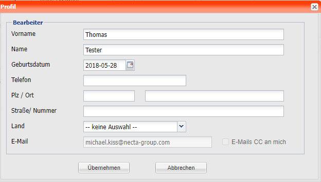 Profil Info An dieser Stelle ist es für den Bearbeiter möglich, die im SYSADMIN hinterlegten Stammdaten zu bearbeiten.