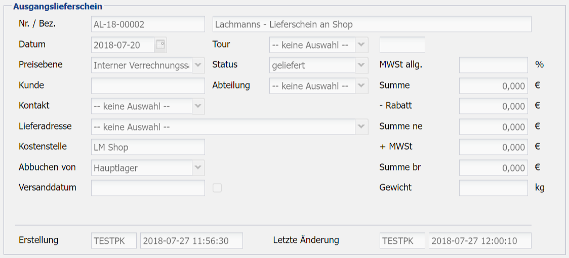 | Summe | Anzeige der Summe des Ausgangslieferscheins vor Abzug von Rabatten. |