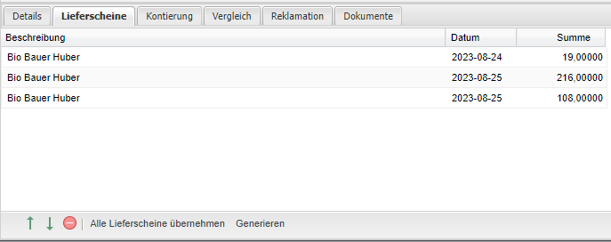 Anzeige der Lieferscheinsumme (netto) des hinzugefügten Lieferscheins. |