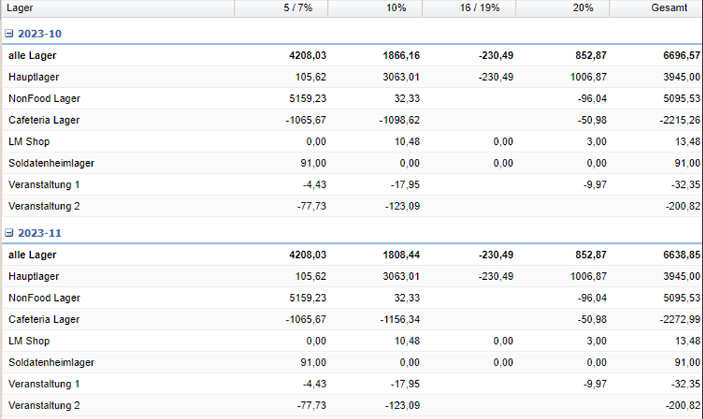 | Gesamt | Anzeige des Gesamtwarenwerts je Lager. |