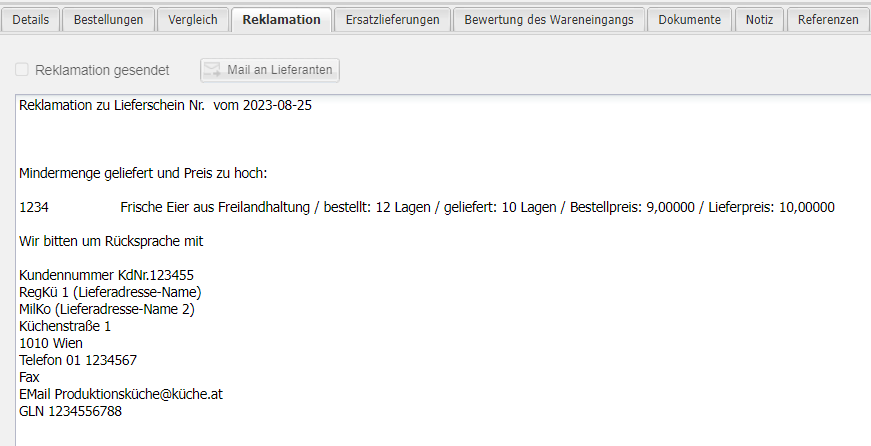 | Mail an Lieferanten | Durch Betätigen des Buttons wird eine E-Mail mit dem automatisch generierten Reklamationstext, an die beim Lieferanten hinterlegte "E-Mailadresse für Reklamationen" versendet. |