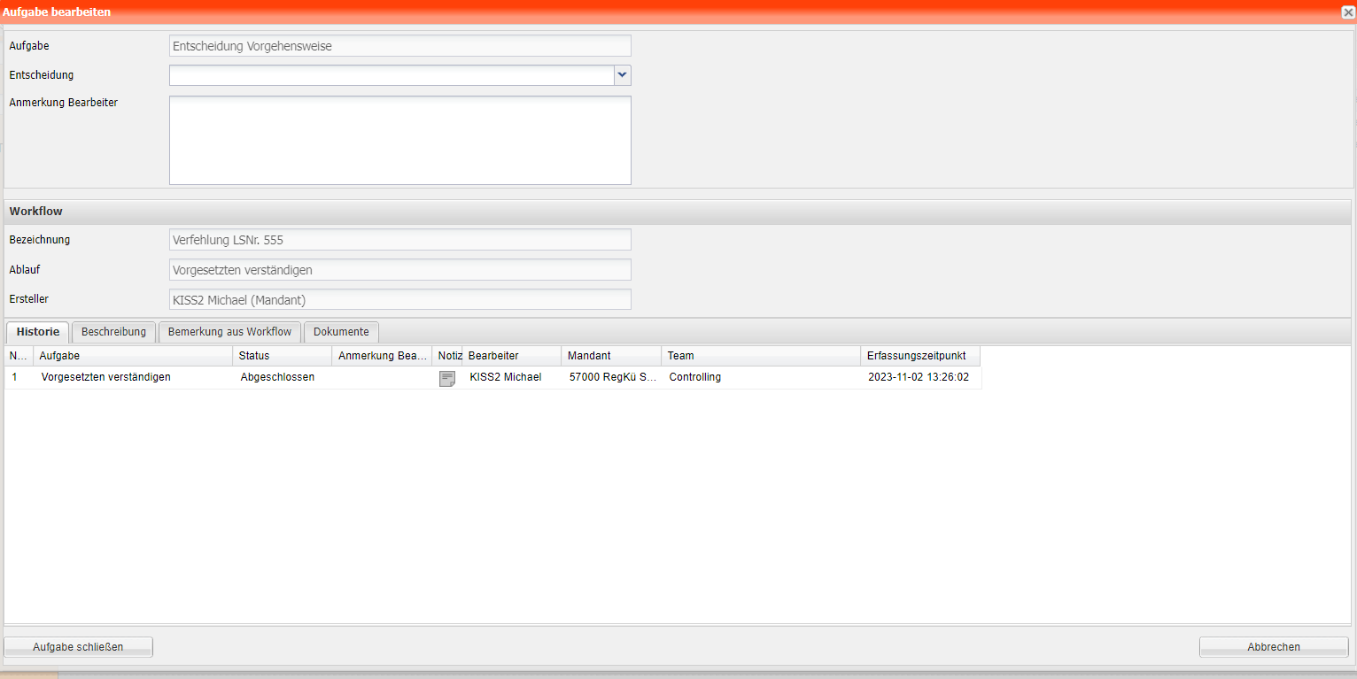 | Workflow | Anzeige des Workflows welche diese Aufgabe beinhaltet. |