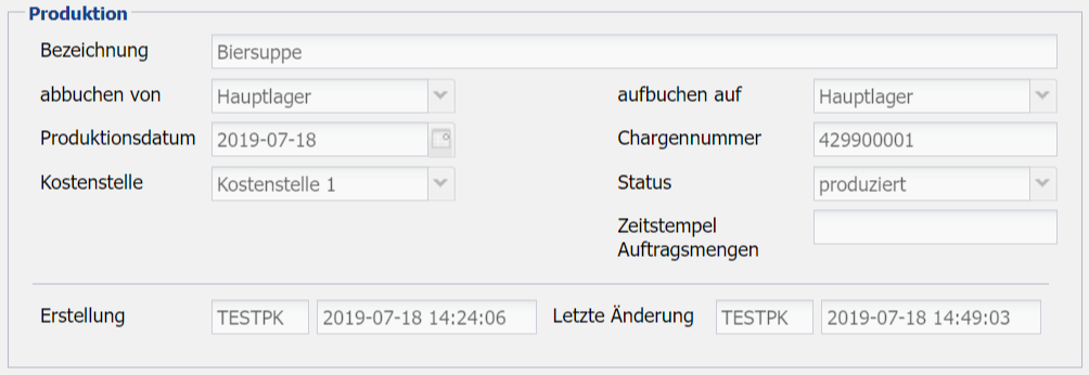 | Produktionsdatum | Auswahl des Produktionsdatums. Sämtliche aus der Produktion ausgelösten Lagerbewegungen erhalten ebenfalls dieses Datum. |