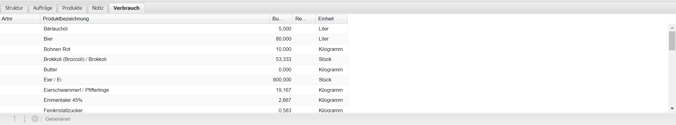 | Generieren | Durch Betätigen des Buttons wird der Verbrauch auf Basis der Rezepturen aller Produkte im Reiter "Struktur" neu generiert. |