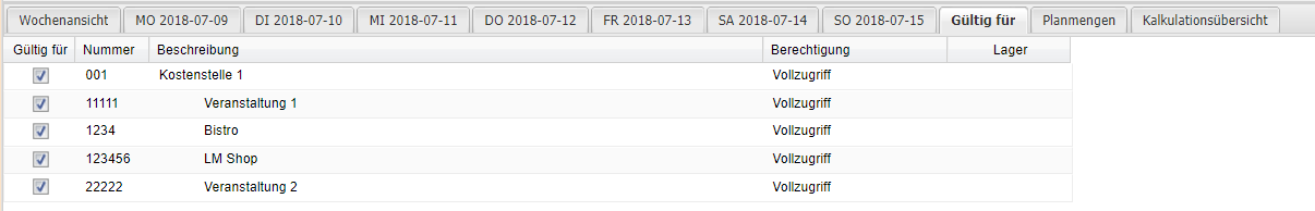 | Gültig für | Durch Setzen des Schalters ist der Wochenmenüplan für diese Kostenstelle gültig. |