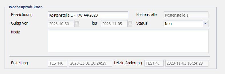 | Bezeichnung | Übernehmen der automatisch generierten Wochenproduktionsbezeichnung bzw. Hinterlegen einer eigenen Bezeichnung. |