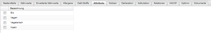 | Diverse Attribute | Durch Setzen des Schalters wird dem Grundprodukt das dynamische Attribut zugeordnet. Im Grundprodukt müssen diese manuell hinterlegt werden. In den Speisen, Getränken bzw. Non-Food Artikeln können diese gegebenenfalls aus den Grundprodukten berechnet werden. Die Berechnungslogiken von Attributen findet man unter Verwaltung - Produktdaten -Attribute |