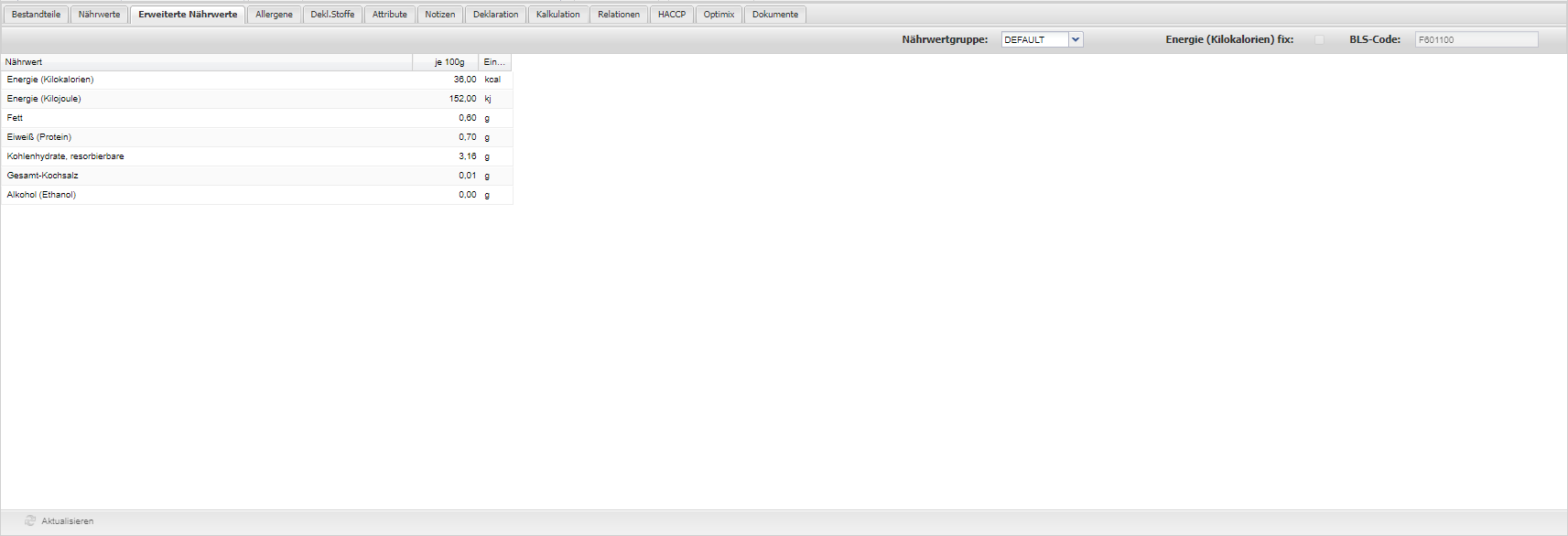 | BLS-Code: | Anzeige des Bundeslebensmittelschlüssels, falls dieser am Grundprodukt hinterlegt wurde. |