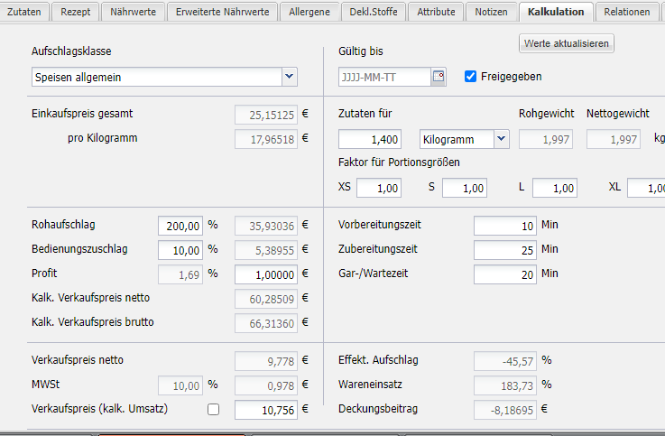 NettogewichtAnzeige des Gewichts, abzüglich Garverlust, Putzverlust, % in fertiger Speise, Brutto-Grundprodukte, usw.