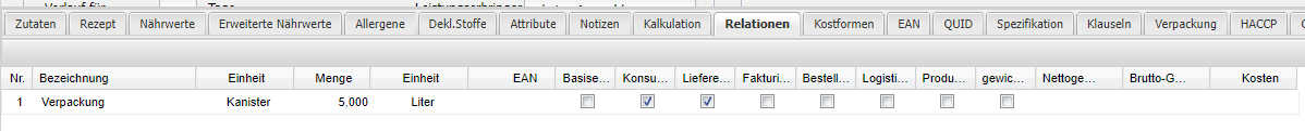 Für jede beim Lieferprodukt angelegte Relation, können in weiterer Folge eine oder mehrere Verpackungen hinterlegt werden.