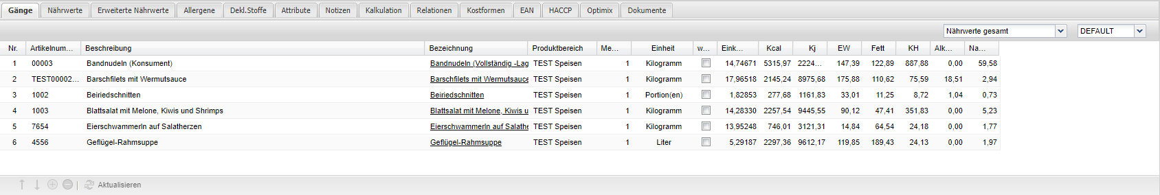 Anzeige der Natriumchlorids (Kochsalz) bezogen auf die gesamte Kalkulationseinheit. Über das Dropdown oberhalb, kann auch auf Nährwerte je 100g gewechselt werden. |