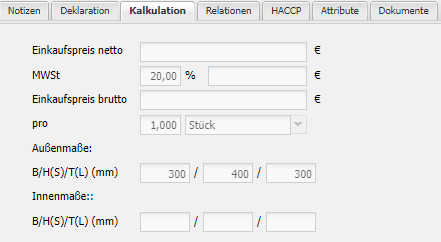 Hinterlegen einer Kalkulationseinheit für den Verbrauchsstoff. Diese Kalkulationseinheit hat Auswirkungen auf die Einheit in welcher man den Bestandteil in einer(s) Speise/Getränk anlegt, sowie auf die Einheit welche in der Inventur verwendet wird und bei verschiedenen Auswertungen. |