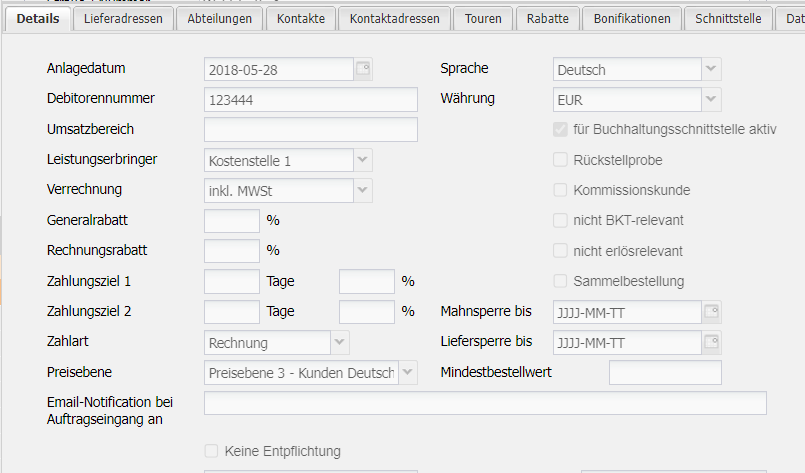 | Debitorennummer | Hinterlegen der Debitorennummer des Kunden (Auswirkung auf Buchhaltungsschnittstelle) |