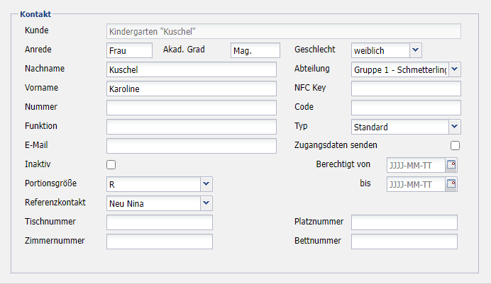 | Referenzkontakt | Hinterlegung des Kontakts, der als Begleitperson dieses Kontakts geführt wird. |