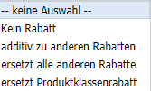 | Rabattart | Zusätzlich zu den Rabatten (Generalrabatt und Zusätzlicher Rabatt) kann man auch Rabatte auf einzelne Artikel hinterlegen. |