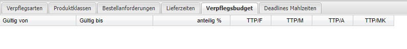 | Budget je Verpflegsklasse | Als Basis für die gesamte Berechnung des WES BKT sowie der Anzahl der BKT, dient das innerhalb der Menüplanklasse hinterlegte Verpflegsbudget je Verpflegsklasse. |