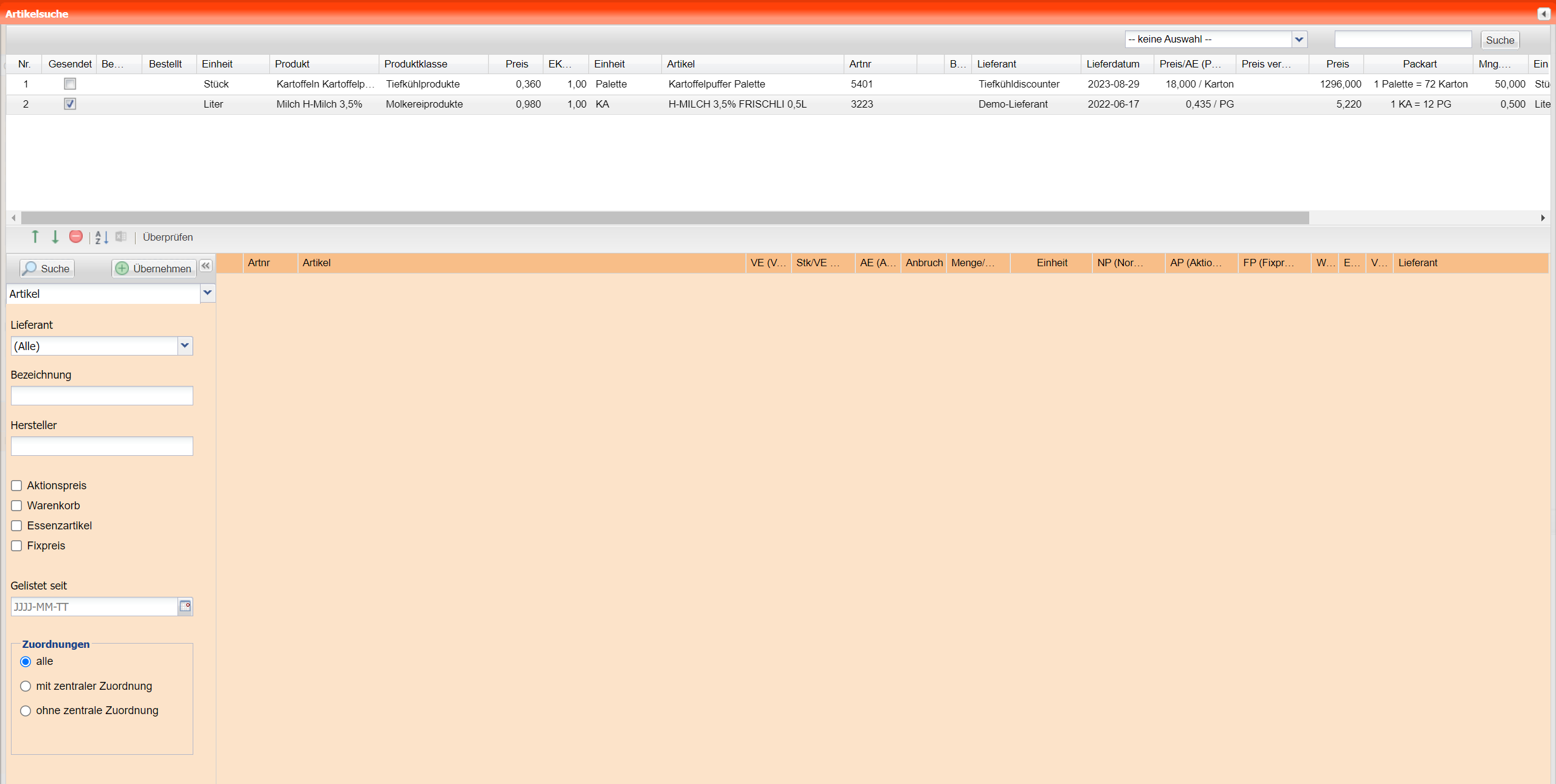 Die "Artikelsuche" wird u.a. dafür verwendet, die Einkaufsartikel bei den diversen Lieferanten zu suchen und der Musterbestellung hinzuzufügen.