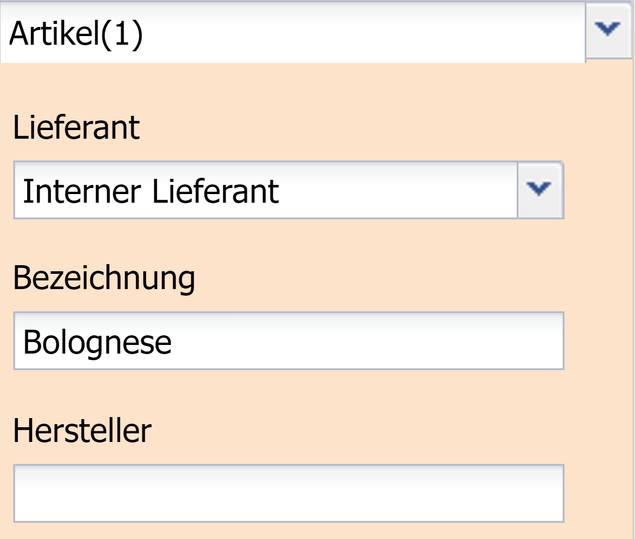 Wenn man nach einem Lieferantenartikel suchen möchte, welchen man der Bestellunghinzufügen möchte, werden hier die Sucheinstellungen hinterlegt. In diesem Fall wurde beim Lieferanten "Interner Lieferant" nach der Artikelnummer "Bolognese" gesucht.