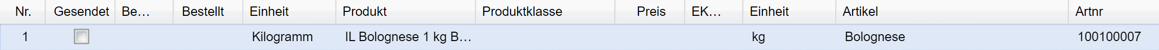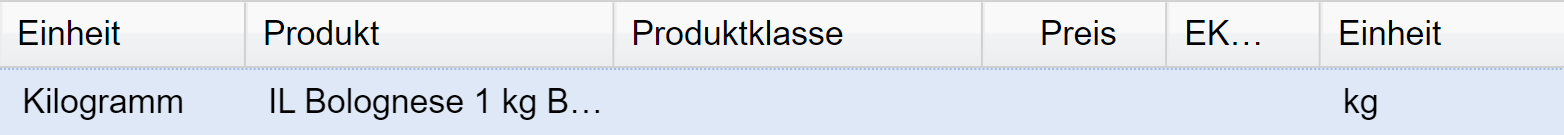 Bei diesem Artikel besteht bereits eine Zuordnung zu einem Grundprodukt. Erkennbar daran, dass in der Spalte "Produkt" das Produkt "IL Bolognese 1kg B..." angezeigt wird. Sollte das Feld in dieser Spalte leer sein, muss eine Zuordnung zu einem Produkt erfolgen. Wie diese Zuordnung erfolgt, sehen Sie unter Zuordnen von Lieferantenartikel.