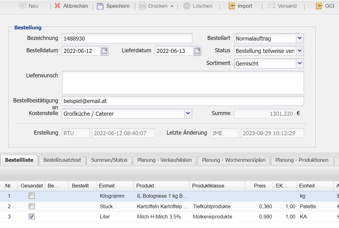 - Bestellung über die Produktion (Bestellung mit berechneten Werten)