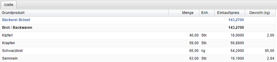 In der EInkaufsstatistik sieht man dann den Lieferanten (blau geschrieben), die Produktklasse (fett geschrieben) und die einzelnen Grundprodukte, welche eingekauft wurden.