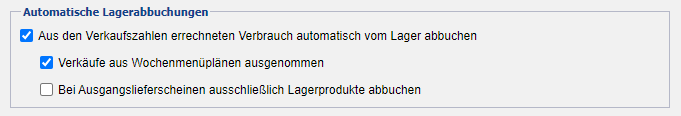 Ist der Schalter gesetzt, werden beim Speichern einer Verkaufsstatistik für alle eingetragenen Produkte die verwendeten Einkaufsartikel ermittelt und vom lagerwirksam abgebucht. Produkte mit der Kennung „Lagerprodukt“ werden als Ganzes abgebucht. Dieser Schalter wirkt prinzipiell auch auf den Verkauf über Ausgangslieferscheine.