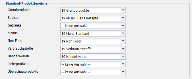 Auswahl eines Standardproduktbereiches, welcher beim Erstellen von Produkten automatisch zum Speichern vorbelegt wird.