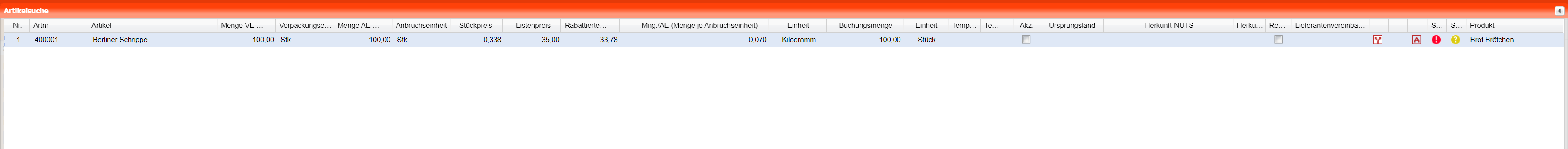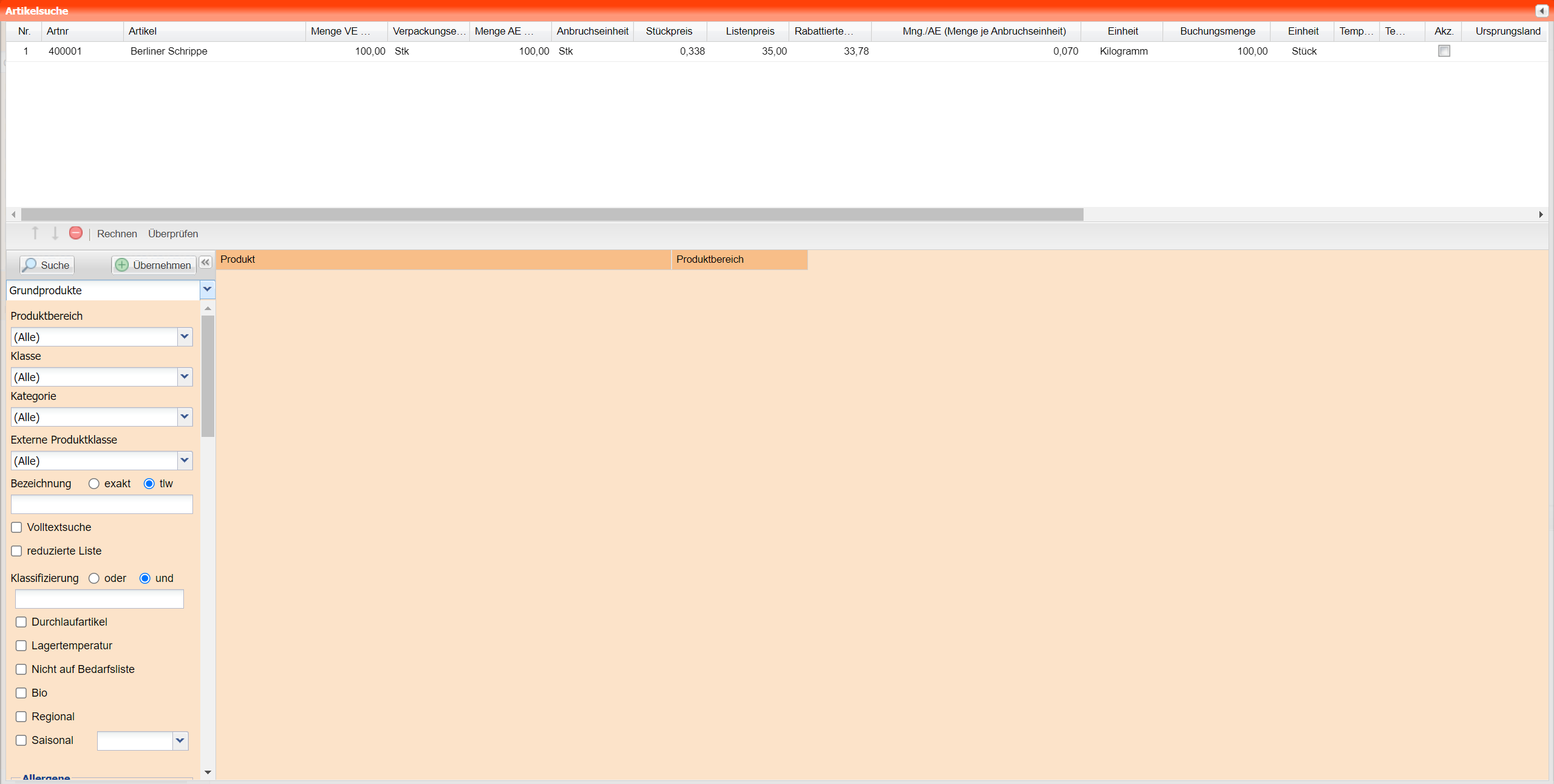 Unter "Bezeichnung" kann man nach den Einkaufsartikeln suchen. Entweder per Artikelnummer oder nach der Artikelbezeichnung. In diesem Fall wurde die Artikelnummer gewählt.