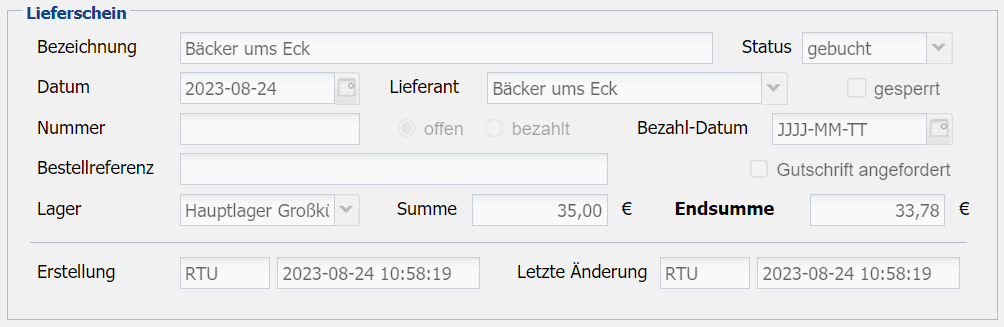 Per Klick auf den "Pfeil zurück"-Button, kehrt man zur Hauptansicht zurück, in welcher man den Lieferschein per "Speichern" fertigstellt.