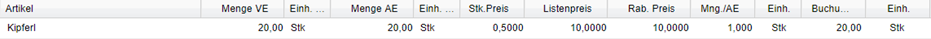 Hier wird 20,00 (Stk) x 1,00 (Stk) = 20,00 Stk errechnet. Somit werden 20,00 Stk Kipferl aufs Lager gebucht.