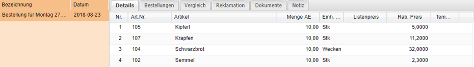 Per "Doppelklick" auf die "Bestellung für Montag 27.08.2018" wird der Lieferschein in die Bestellung geladen: