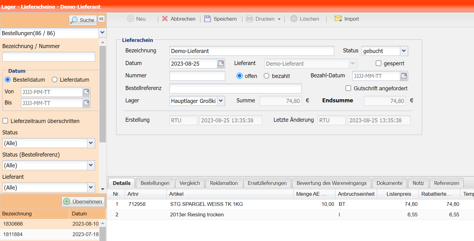 Per "Klick" auf den "Import"-Button wird der elektronische Lieferschein in den Lieferschein geladen.