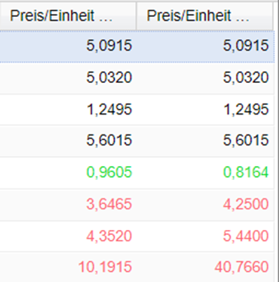 Bei Unterschieden von Bestellpreisen und Lieferpreisen werden diese rot bzw. wenn es zum Vorteil des Kundens ist grün markiert.