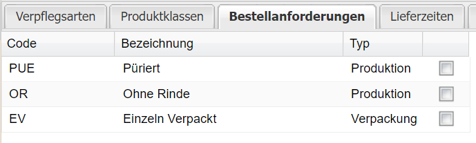 Per Häkchen in der rechten Spalte legt man fest, welche Bestellanforderungen in dem Menüplanprofil aktiv sind.