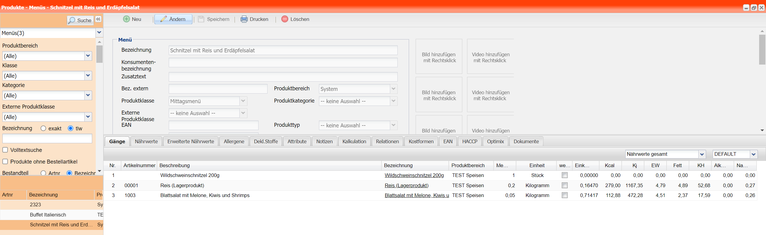 An dieser Stelle kann über verschiedene Filtermöglichkeiten nach den Gängen (Speisen) gesucht werden. In diesem Fall wurde der Produktbereich "(Alle)", die Produktklasse "Mittagsmenü" und die Bezeichnung "Schnitzel" gewählt.