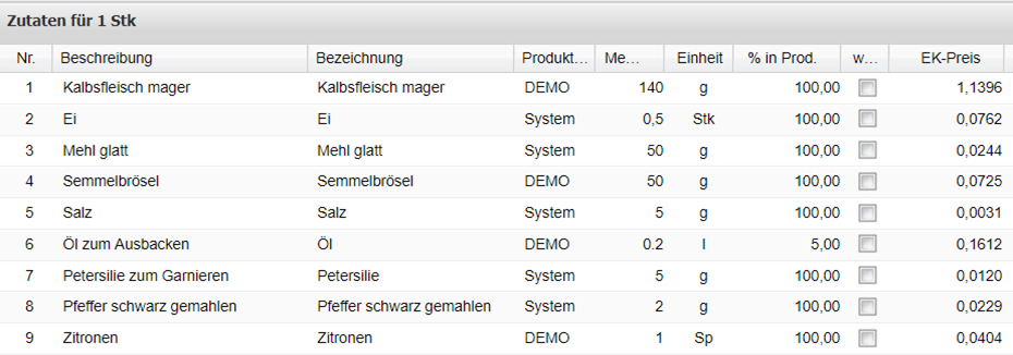 In diesem Fall ist die Kalkulationseinheit mit einem Stück hinterlegt (Siehe Punkt 7). Das bedeutet, dass die Menge der Zutaten in der Zutatenliste hinterlegt werden muss, die man für ein fertiges Wiener Schnitzel vom Kalb benötigt.