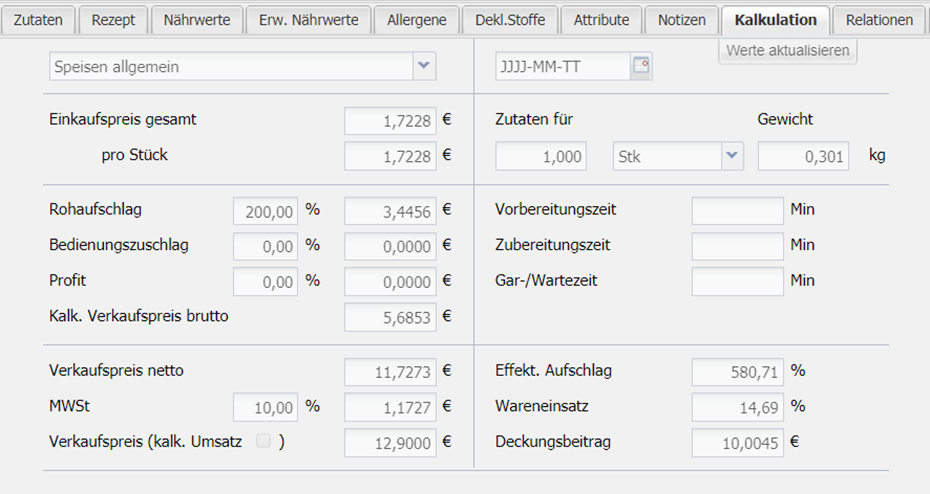 Mehr Informationen zu der Kalkulation finden Sie unter Speisen - Kalkulation.