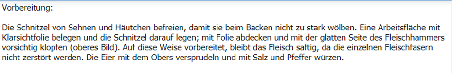 In diesem freien Textfeld können Sie die einzelnen Arbeitsschritte hinterlegen. Diese werden bei diversen Drucken (z.B. Rezepte) mit angedruckt.