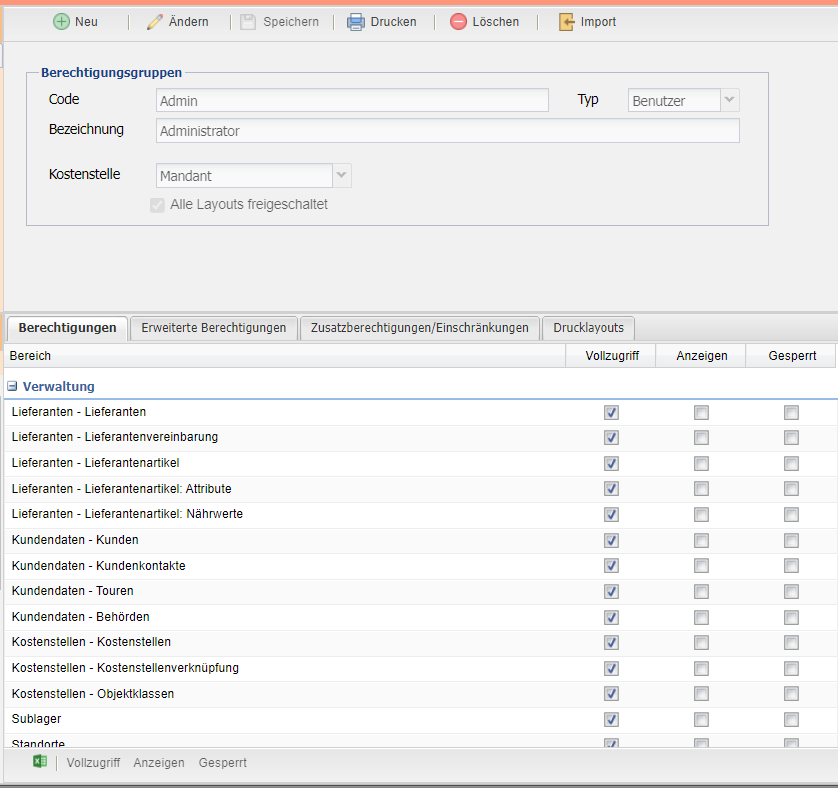 Auf der linken Seite finden Sie eine Liste aller Berechtigungsgruppen, es kann eine Berechtigungsgruppe ausgewählt werden. Die Berechtigungsgruppen werden in alphabetischer Reihenfolge angezeigt.