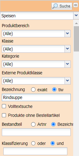 Hier können die Produkte nach diversen Suchkriterien gefiltert und gesucht werden. Hier wird nach der Bezeichnung "Rindsuppe" gesucht. Per Klick auf den Button "Suche" wird die Speise im links unteren Fenster angezeigt.